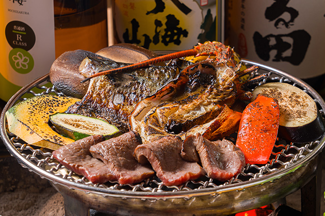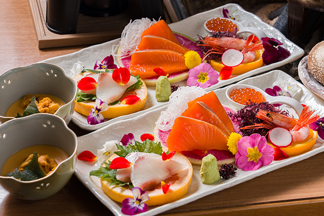 旅籠の夕食は、料理長が厳選した旬の北海道産食材を使用した囲炉裏会席をご用意。