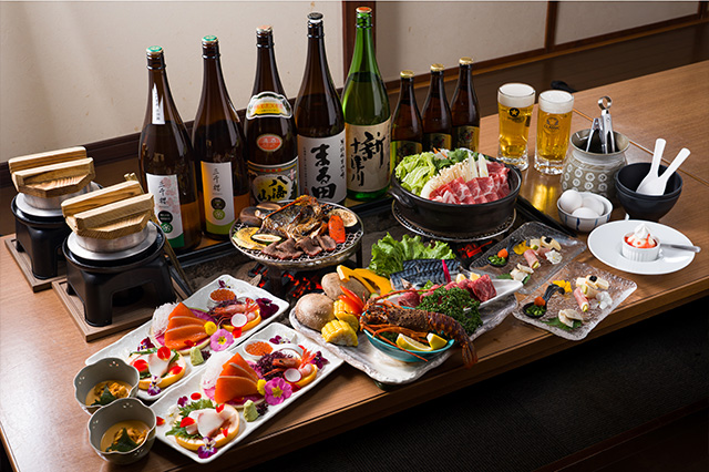 旅籠の夕食は、料理長が厳選した旬の北海道産食材を使用した囲炉裏会席をご用意。